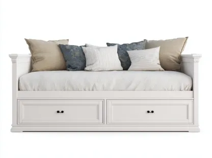 Le meuble est fabriqué à partir de panneaux en bois robustes avec une finition blanche soignée. L'assise est conçue pour accueillir des coussins et un matelas, tandis que les tiroirs inférieurs offrent un espace de rangement discret et fonctionnel.