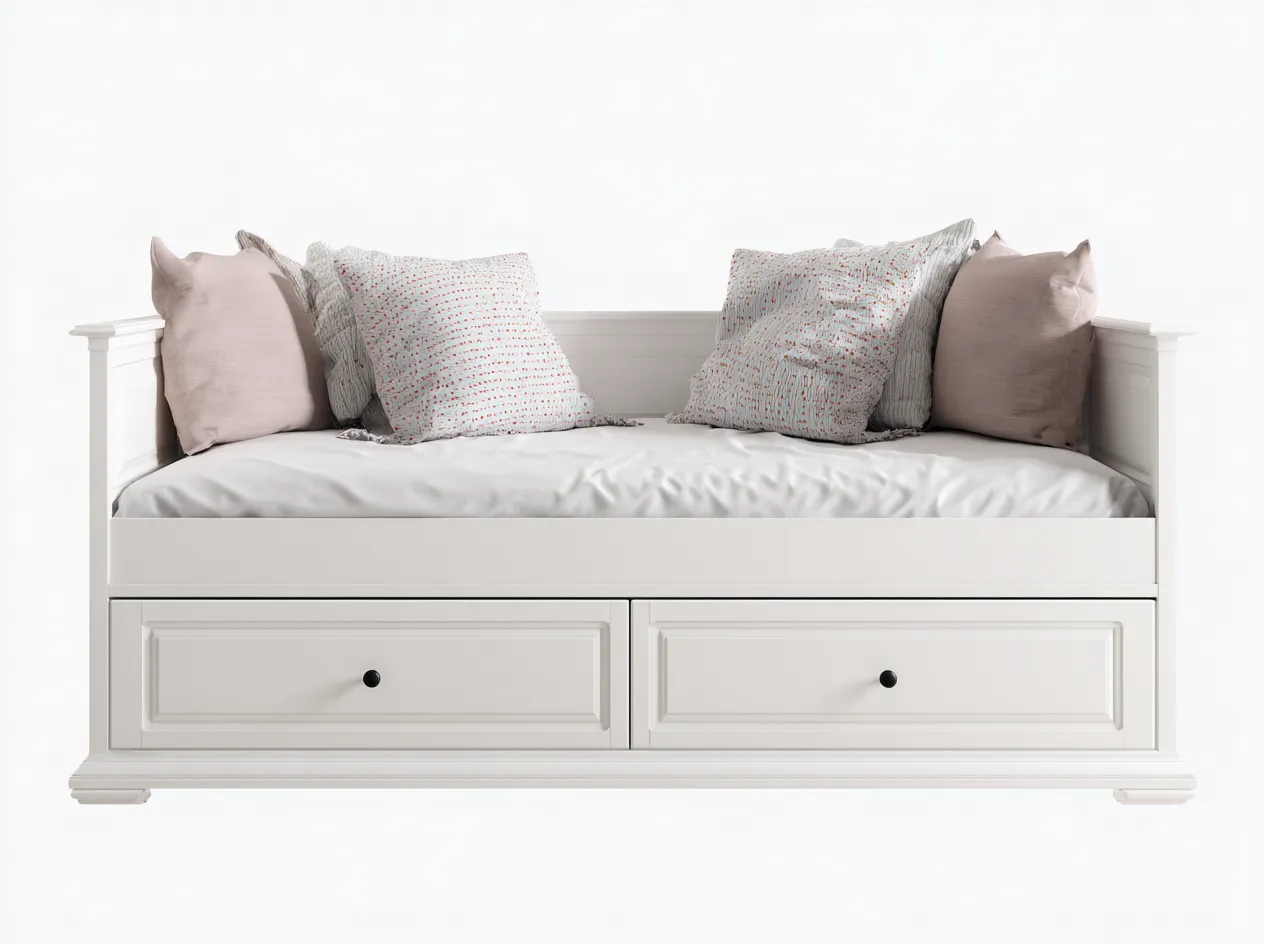 La structure est conçue en bois peint en blanc, garantissant stabilité et résistance. La surface d'assise est habillée d'un tissu clair, avec une finition soignée adaptée à un usage quotidien.