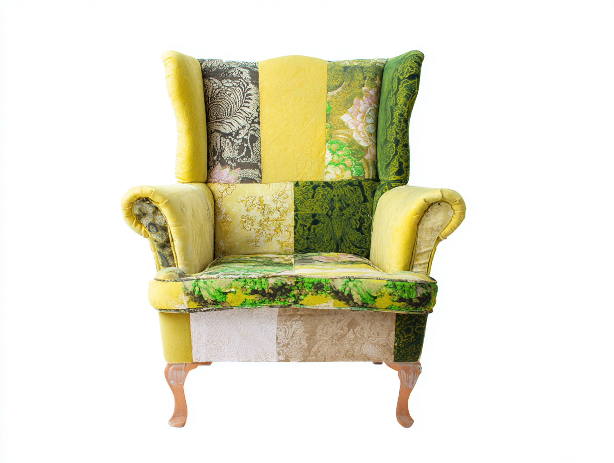 Ce fauteuil à oreilles se distingue par son revêtement patchwork riche en nuances de jaune et de vert, apportant une forte identité décorative à l'espace de vie. Son dossier haut avec oreilles latérales crée une assise enveloppante, idéale pour un coin lecture ou détente dans le salon.